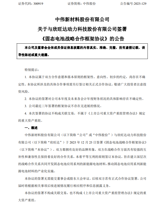 12月25日,中伟股份(300919.SZ)公告称,公司与欣旺达(300207.SZ)于2025年12月25日签署《固态电池战略合作框架协议》全国炒股配资门户,双方将围绕各自发展战略,在前驱体产品技术开发,产品供应、正极材料开发及全球产能布局等领域开展全方位的战略合作。本次合作旨在建立深层次的战略合作关系共同开发固态电池应用系列的新能源电池材料,推动固态电池应用系列新能源电池材料的产业化实施。本协议属于双方合作意愿和基本原则的框架性、意向性、初步的约定,尚存在不确定性。